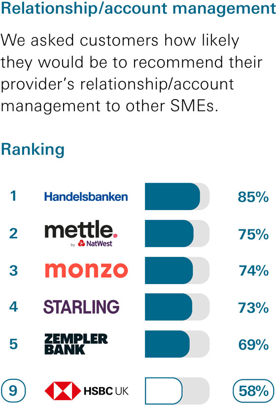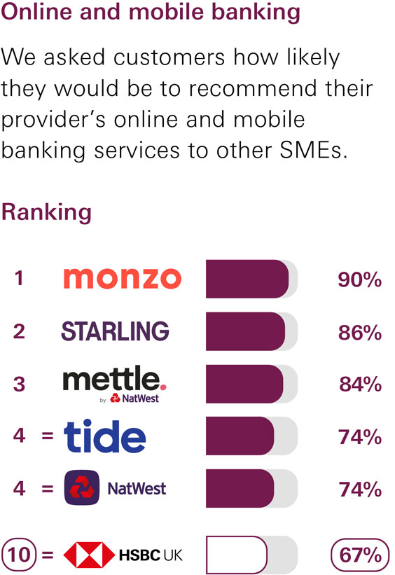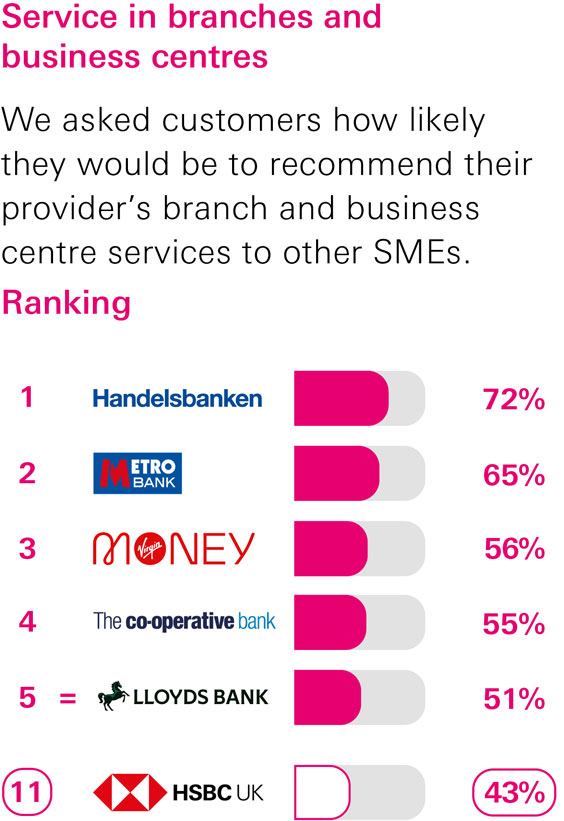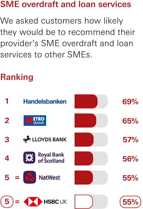 SME customers with business current accounts were asked how likely they would be to recommend their provider, their provider’s online and mobile banking services, services in branches and business centres, SME overdraft and loan services and relationship/account management services to other SMEs.
