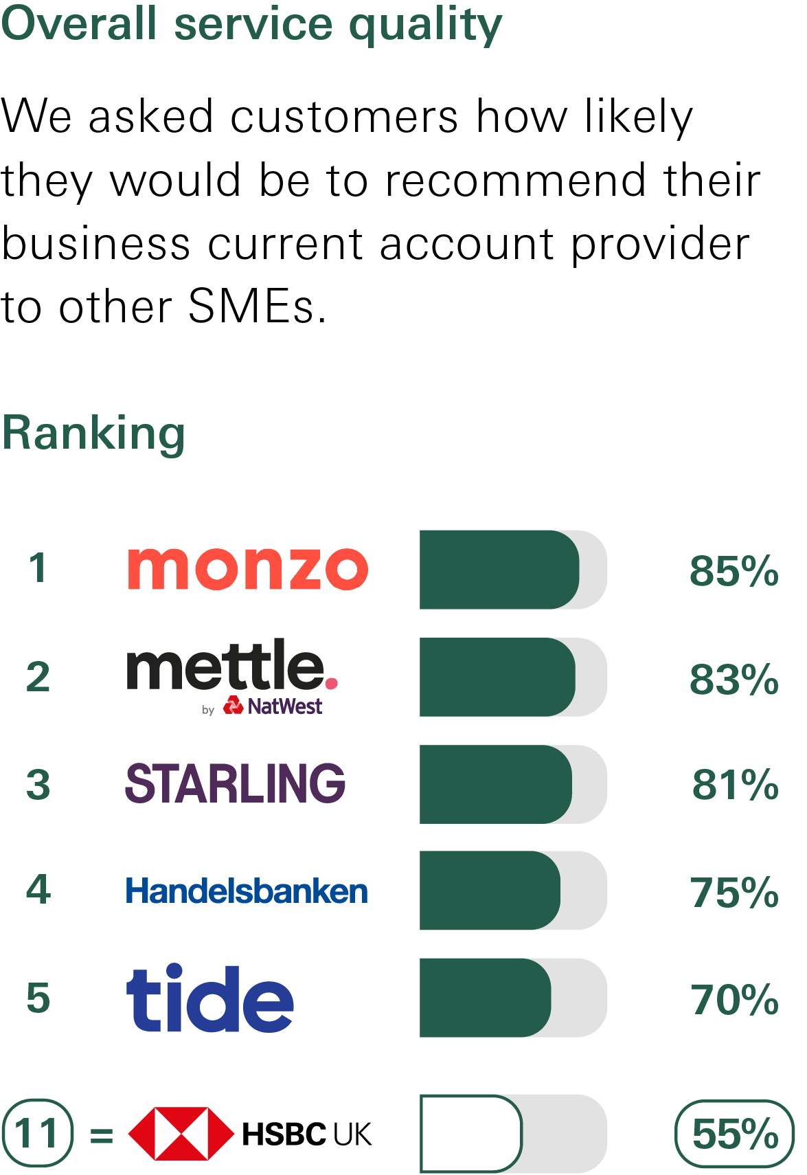 HSBC UK has published this information at the request of the Competition and Markets Authority so you can compare the quality of service from business current account providers. In providing this information, we are not giving you any advice or making any recommendation to you and we can only give you information about our own products and services.